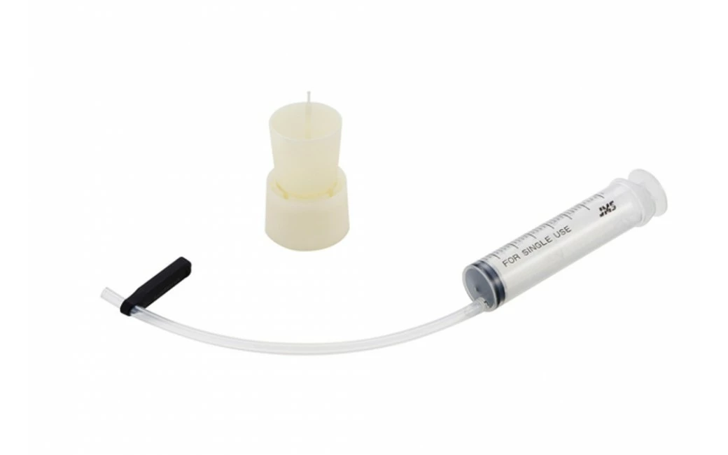 Contient une seringue graduée avec flexible et pince arrêt, un entonnoir.
