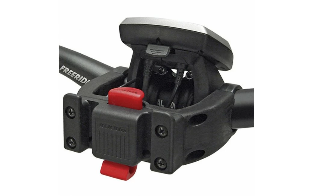 Le support de guidon Klickfix pour vélo électrique est idéal pour mettre un panier ou une sacoche de guidon quand l’ordinateur du vélo se place au niveau de la potence.